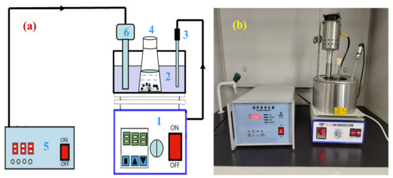 Experimental apparatus for ultrasound leaching: (a) schematic diagram; and (b) device diagram. In (a), 1—heat collection type thermostatic bath; 2—water bath; 3—thermometer, 4—conical flask; 5—ultrasonic generator; 6—ultrasonic probe.