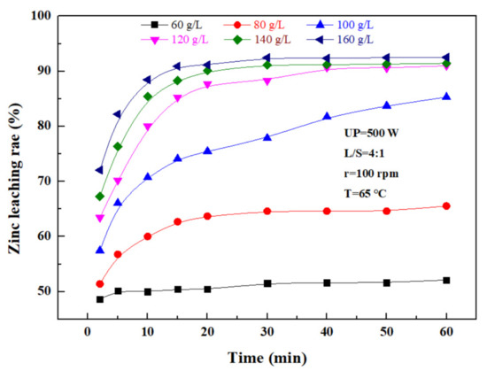 The effect of the sulfuric acid concentration on the leaching rate of zinc was investigated under an ultrasonic power of 500 W, a liquid–solid ratio of 4:1, a rotating speed of 100 rpm, and a temperature of 65 ℃. According to Figure 7, the zinc leaching rate also increased with sulfuric acid concentration. With time, the zinc leaching rate was increasing because the hydrogen ion concentration in the reaction increased with the sulfuric acid concentration. Promoting the contact of sulfuric acid with a granular zinc phase in zinc oxide dust was conducive to the leaching of zinc from the dust, but with time, hydrogen ions in the solution were consumed, and thus, the leaching rate was gradually lowered. Considering the high concentration of sulfuric acid, the dissolved Fe3+ ions increased accordingly, making it difficult to perform the subsequent treatment of the leaching solution. Therefore, the optimal concentration of sulfuric acid was determined to be 140 g/L.