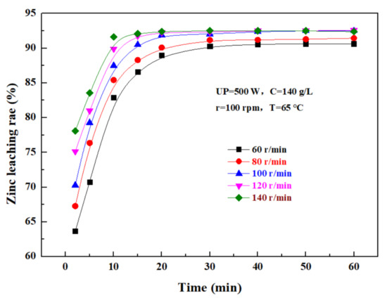 The effect of the rotating speed on the leaching rate of zinc from the zinc oxide dust was investigated under an ultrasonic power of 500 W, a sulfuric acid concentration of 140 g/L, liquid–solid ratio of 5:1, and a temperature of 65 °C. The results were as shown in Figure 9. It can be seen that, as the rotating speed increases, the leaching rate of zinc from the zinc oxide dust gradually increases with time, and ultimately reaches a plateau. If the stirring speed was low, the zinc oxide dust particles dissolved in sulfuric acid solution were easy to settle, which was not conducive to the leaching reaction, while an excessively high stirring speed would increase the energy consumption and the cost of the leaching process. Therefore, it is advisable to control the stirring speed at 100 rpm.
