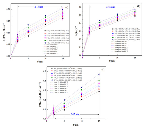 It should be mentioned that the experimental data for the initial stage of the process (0–2 min) are ignored in Figure 11a–c. The purpose was to reduce the data disturbance caused by the uncontrolled transfer process in the initial stage. Bringing relevant data into the model will make it difficult for the fitting results to correctly reflect the kinetic conditions of the main reaction process. Therefore, the 2–15 min stage is selected for fitting the experimental data. Similar research methods were applied in the study of Wang et al. [39] and Gui et al. [41].