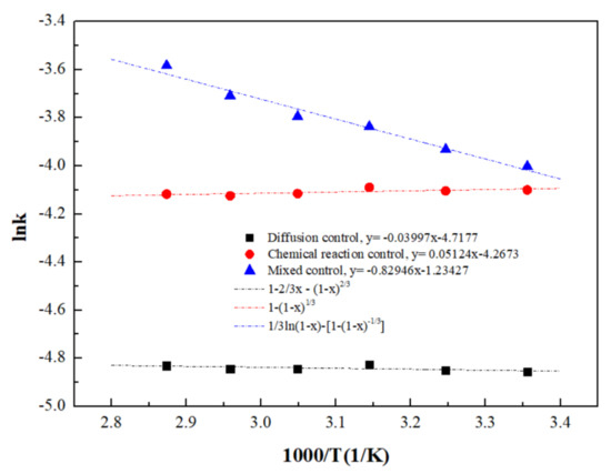In addition, the reaction rate constant k before the zinc leaching process approaching equilibrium (i.e., a fitting equation) at different temperatures was obtained according to Figure 11a–c and substituted into the Arrhemus empirical equation, respectively, as follows: