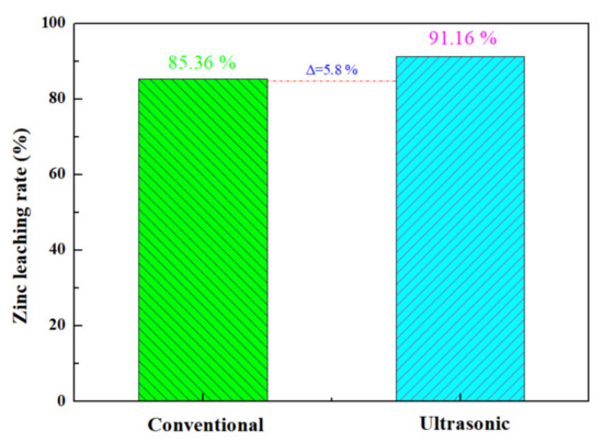 The optimal zinc leaching conditions for zinc oxide dust under an ultrasonic field determined under time conditions are as follows: leaching temperature 25 °C; ultrasonic power 500 W; sulfuric acid concentration 140 g/L; liquid–solid ratio 5:1; rotating speed 100 rpm; and leaching time 30 min, for which the zinc leaching rate can reach 91.16%. Under the optimal process conditions, a comparison between conventional stirring and ultrasound enhancement for an effect on the leaching rate of the zinc from oxide dust was conducted. The results are as shown in Figure 13: the zinc leaching rate under conventional stirring was 85.36%, and was increased by 5.8% under ultrasound enhancement at 500 W.
