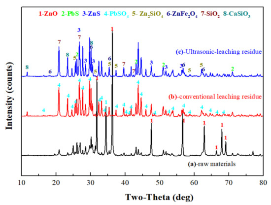 The XRD patterns of the zinc oxide dust and leached residue are as shown in Figure 14. Obviously, the ZnO phase was mostly dissolved after sulfuric acid leaching, and for the conventional leached residue, there was still a ZnO peak. The reason for this might be that there were wraps in the zinc oxide dust, and the ZnO in the wrapped particles was not leached. For both ultrasonic leached residue and conventional leached residue, the ZnO peak intensity was weakened or the peak disappeared as compared with the raw material. Zinc in the residues existed in forms of ZnFe2O4, Zn2SiO4, and ZnS accompanied by large amounts of PbSO4, PbS, and SiO2.