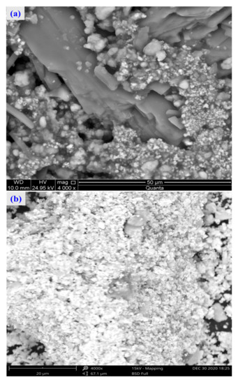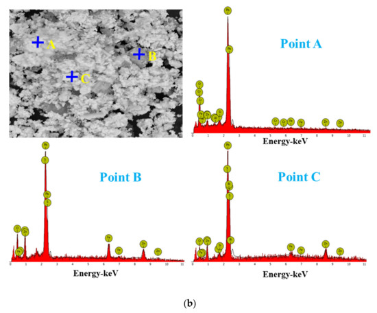 EDS point analysis of the conventional leaching residue (a), and the ultrasonic leaching residue (b).