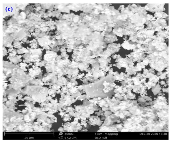 SEM patterns of raw materials (a), conventional leaching residue (b), and the ultrasonic leaching residue (c).