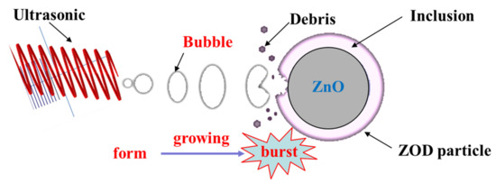 The schematic diagram of the leaching mechanism of ultrasonic-enhanced ZOD particle.