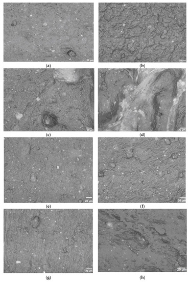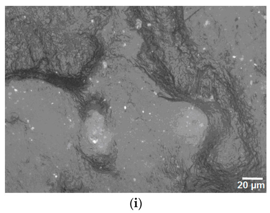 The absence of the elastomer promoted gap formation between the hydrophobic PP matrix and the hydrophilic n-clay (Figure 5c,d). This behavior could be also due to the poor mixing that occurred during the melt processing between the PPW and n-clay with an impact on the decrease of the mechanical properties. Meanwhile, the addition of n-clay tended to form aggregates in the absence of elastomer, due to the hydroxyl groups on the surface of n-clays, which formed hydrogen bonds and attracted each other. The SBSBC or SISBC appeared as dispersed droplets in the PPW matrix (Figure 5b,g), encapsulating the n-clay particles (Figure 5e,f,h,i). This composite morphology enhanced the efficiency of the n-clay–thermoplastic matrix blending compared to the composites without elastomers and would improve the impact strength property of PPW composites. SBSBC exhibited a more effective adhesion between the polymeric matrix and n-clay, as compared with SISBC. In addition, the surface energy, wettability, and interfacial adhesion between phases led to the PPW/elastomer/filler composite’s phase structure [34].