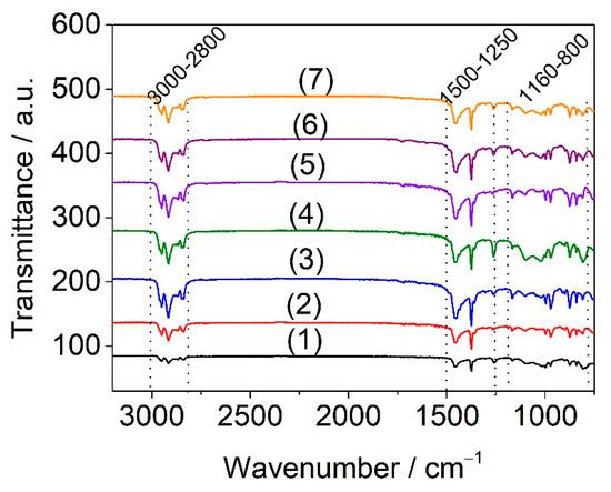 ATR-FT-IR spectra of PPW (1), PPW/SBSBC (2), PPW/SBSBC/n-Clay 5% (3), PPW/SBSBC/n-Clay 10% (4), PWP/SISBC (5), PPW/SISBC/n-Clay 5% (6), and PPW/SISBC/n-Clay 10% (7) samples.