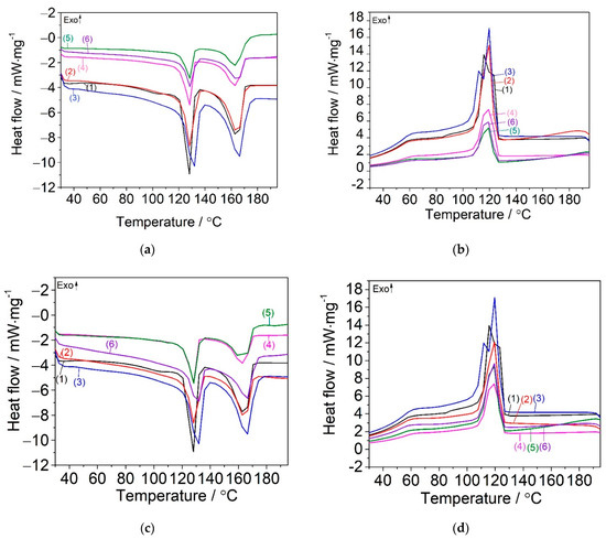 DSC curves of PPW (1), PPW/SBSBC (2), PPW/n-Clay 5% (3), PPW/n-Clay 10% (4), PPW/SBSBC/n-Clay 5% (5), PPW/SBSBC/n-Clay 10% (6) samples (a) melting and (b) crystallization steps; PPW (1), PWP/SISBC (2), PWP/n-Clay 5% (3), PPW/n-Clay 10% (4), PPW/SISBC/n-Clay 5% (5), PPW/SISBC/n-Clay 10% (6) samples (c) melting and (d) re-crystallization steps.
