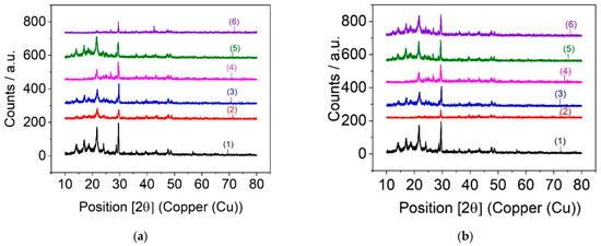 XRD patterns of PPW (1), PPW/SBSBC (2), PPW/n-Clay 5% (3), PPW/n-Clay 10% (4), PPW/SBSBC/n-Clay 5% (5), and PPW/SBSBC/n-Clay 10% (6) samples (a) and PPW (1), PPW/SISBC (2), PWP/n-Clay 5% (3), PPW/n-Clay 10% (4), PPW/SISBC/n-Clay 5% (5), PPW/SISBC/n-Clay 10% (6) samples (b).