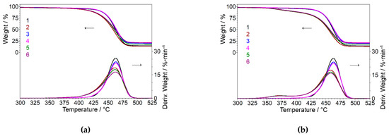 Thermal analysis of PPW composites was carried out using a DSC 823e calorimeter supplied by Mettler Toledo (Greifensee, Switzerland), previously calibrated with an indium standard. Samples weighing between 8 and 10 mg were packed in aluminum pans and placed in the DSC cell. The samples were first heated from ambient temperature to 195 °C at a rate of 10 °C min−1, kept 2 min at 195 °C, in order to erase any previous thermal history, and then cooled to ambient temperature at the same heating rate. The crystallization temperature (Tc), melting enthalpy (ΔHm), and peak melting temperature (Tm) were evaluated from the cooling and the first heating cycle, respectively. The degree of crystallinity (Xc) was calculated from DSC curves, according to Equation (1)