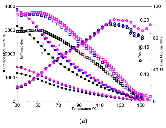 The viscoelastic properties, such as storage modulus (E′), loss modulus (E″), loss factor (tan δ), and stiffness of PPW composites as a function of temperature were determined using a DMA Q800 equipment (TA Instruments Inc., New Castle, DE, USA), which operated with dual cantilever bending. Data processing was performed with Universal Analysis 2000 software (Version 4.5 Build 4.5.0.5, New Castle, DE, USA). Rectangular specimens having a width of 10.56 mm, a thickness of 4 mm, and a length of 60 mm were examined according to the testing program conducted, from ambient temperature to 150 °C, with a constant heating scan of 3 °C min−1, a frequency of 1 Hz, and amplitude of 15 µm.