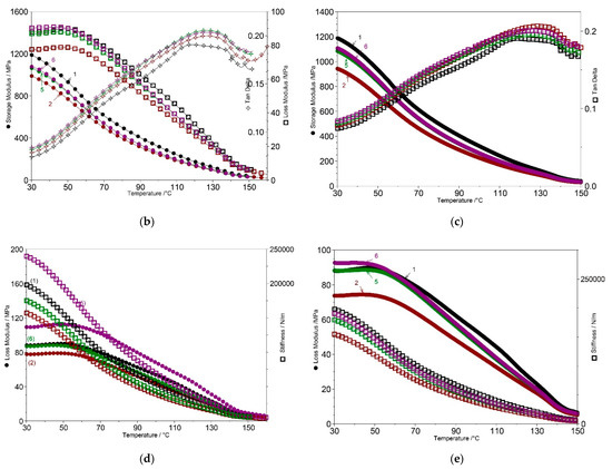 Dynamic mechanical analysis (DMA) analysis. Storage modulus (●), Stiffness modulus (◾), tan δ (🞉), and loss modulus (◽) as a function of temperature (1-PPW (black color), 3-PPW/n-Clay 5% (blue color), 4-PPW/n-Clay 10% (purple color)) (a); Storage modulus (●), tan δ (⯎), and loss modulus (◽) as a function of temperature (1-PPW (black color), 2-PPW/SBSBC (wine color), 5-PPW/SBSBC/n-Clay 5% (olive color), 6-PPW/SBSBC/n-Clay 10%) (purple color) (b); Storage modulus (●), and tan δ (◽) as a function of temperature (1-PPW (black color), 2-PPW/SISBC (wine color), 5-PPW/SISBC/n-Clay 5% (olive color), 6 PPW/SISBC/n-Clay 10% (purple color)) (c); Loss modulus (●) and stiffness (◽) as a function of temperature (1-PPW (black color), 2-PPW/SBSBC (wine color), 5-PPW/SBSBC/n-Clay 5% (olive color), 6 PPW/SBSBC/n-Clay 10% (purple color)) (d); Loss modulus (●) and stiffness (◽) as a function of temperature (1-PPW (black color), 2-PPW/SISBC (wine color), 5-PPW/SISBC/n-Clay 5% (olive color), 6-PPW/SISBC/n-Clay 10% (purple color)) (e).