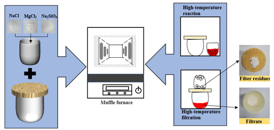 Thermodynamic calculations of the MgCl2-Na2SiO3-NaCl system were carried out using Factsage 8.1. The calculation process used the “Phase Diagram” and “Reaction” modules. Thermodynamic calculations were used as a theoretical basis to guide the subsequent experiments.