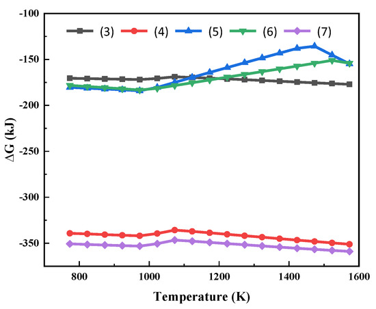 Gibbs free energy of the reactions (3)~(7) at different temperatures.