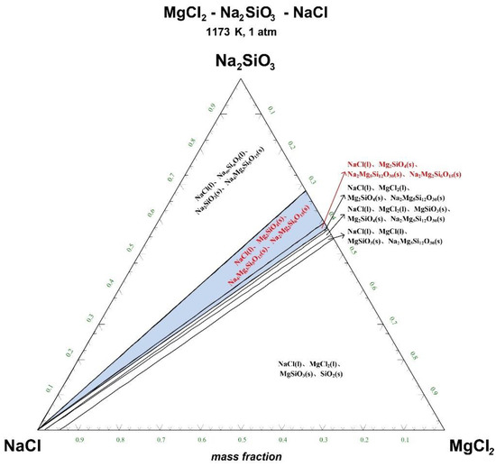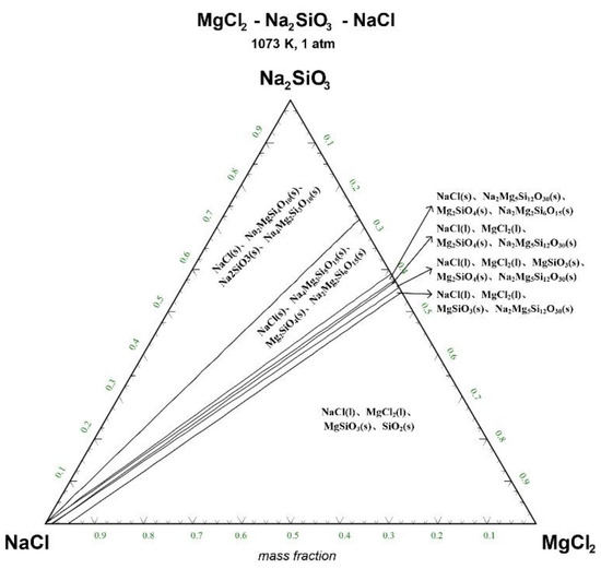 The ternary phase diagrams of MgCl2-Na2SiO3-NaCl at a temperature of 1073 K, 1173 K, 1273 K, and 1373 K are shown in Figure 4, Figure 5, Figure 6 and Figure 7.