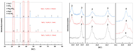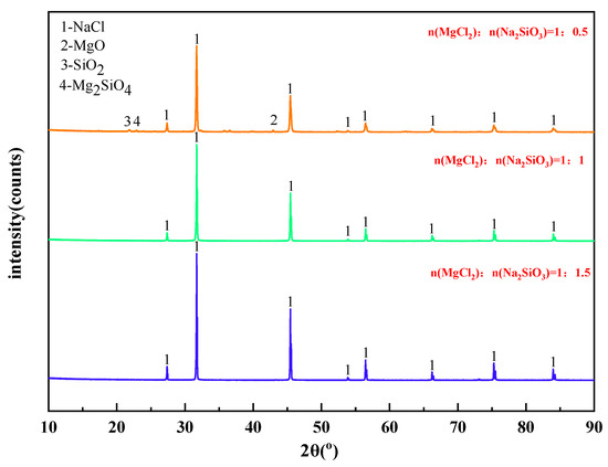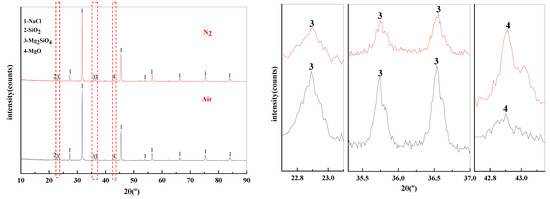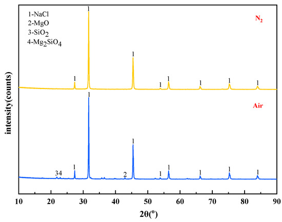 The mass content of MgCl2 in raw materials is 10%. When the temperature is 1273 K and the molar ratio of added MgCl2:Na2SiO3 is 1:0.5, The X-ray diffraction patterns of the reaction filtrates under different atmospheric conditions are shown in Figure 14.