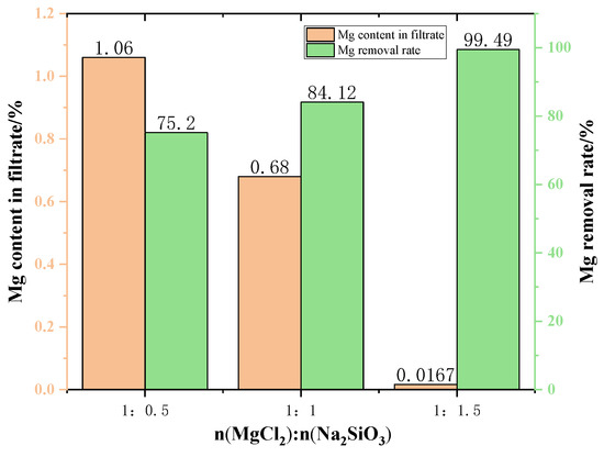 The changes in the Mg removal rate of the filtered samples with different addition dosages are shown in Figure 7. The removal rate of Mg from the samples showed an increasing trend as the addition dosage increased. However, excessive additives will increase the impurities in the filtrate, resulting in lower quality of molten salt. Therefore, the appropriate dosage is the molar ratio of MgCl2:Na2SiO3 from 1:1 to 1:1.5.