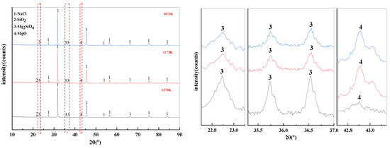 It can be summarized from Figure 11 that the main substance in the filtrate obtained from the experiments under different temperature conditions was NaCl. This is consistent with the content of thermodynamic phase diagrams in Figure 4, Figure 5 and Figure 6. When the phase transition temperature was below 1273 K, the high-temperature phase transition reaction of Mg2+ did not proceed sufficiently. This results in some of the magnesium-silica phases remaining in the filtrate, which degrades the quality of the filtrate. When the phase transition temperature reaches 1273 K, only NaCl remains in the filtrate.
