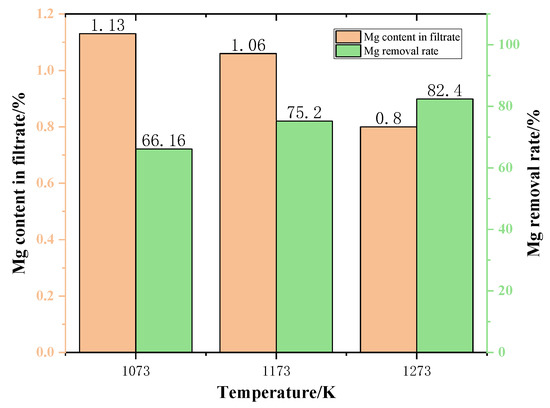 The variation of Mg removal rate of the samples after different temperature reactions is shown in Figure 13. The experimental results are shown in Figure 13. As the phase transition temperature increases, the removal of Mg also increases. This demonstrates that increasing the temperature is advantageous to the removal of Mg from the slags phase. When the phase transition temperature increased from 1073 K to 1273 K, the Mg removal rate increased by 24.55%. In a word, to maximize the Mg removal rate in the phase transition process and minimize the Mg content in the filtrate obtained by filtration, the temperature should be 1273 K.