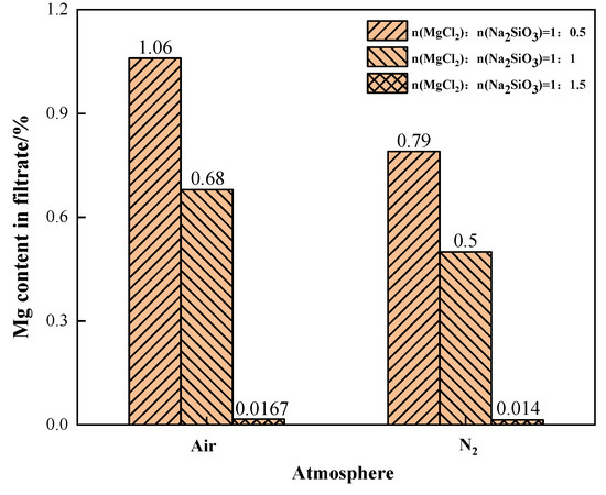 The effects of different phase transition atmospheres on the Mg content in the filtrate were investigated under the conditions of additive dosages MgCl2:Na2SiO3 = 1:0.5, 1:1, and 1:1.5, as shown in Figure 16. When N2 was the phase transition atmosphere, the Mg content in the filtrate was significantly lower than that in the air atmosphere. This indicates that the N2 condition can effectively reduce the content of Mg in the filtrate. When the additive dosage was 1:1.5, the content of impurity Mg in the filtrate was similar and lower in both atmosphere conditions.