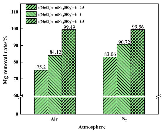 The Mg removal rate increased with the increase of additive dosage when filtering under air or N2 conditions, as shown in Figure 17. When the additive dosage MgCl2:Na2SiO3 was 1:0.5, the increase in Mg removal rate was more obvious after the phase transition experiment under the N2 condition. At this time, N2 should be selected as the phase transition atmosphere in order to remove as much Mg as possible from the raw material. When the additive dosage MgCl2:Na2SiO3 increased to 1:1.5, the Mg removal rate remained similar under the two atmospheric conditions.