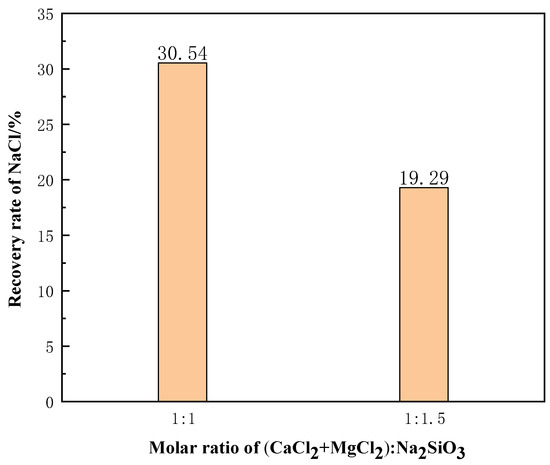 Na2SiO3 is added to the molten salt chloride slags in the molten state to produce the Mg-containing solid phase, which could be separated with the molten NaCl in the novel process. This will result in a higher purity of the resulting NaCl molten salt. The recovery rate of NaCl after high temperature separation was calculated. The calculation formula of NaCl recovery is shown in Equation (2), and the parameters are shown in Table 3.
