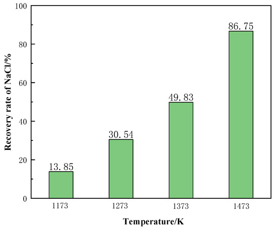 Figure 19 shows the recovery of NaCl from the molten salt chlorination synthetic slags at different temperature conditions. The recovery rate of NaCl increased significantly with the increase of temperature. When the temperature was 1473 K, the recovery rate of NaCl reached 86.75%. In summary, the phase transition temperature is the main factor affecting the recovery of NaCl from molten salt chlorination synthetic slags.
