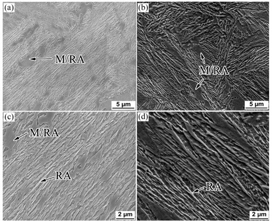 At the same time, the carbon content of the untransformed austenite was about 0.87 wt.% after an isothermal transformation at 300 °C; we predicted that the MS could be reduced to 68 °C (Figure 8b). The untransformed austenite further transformed into new BF in the second bainitic transformation process because the MS was actually lower than 250 °C, which caused carbon enrichment in the untransformed austenite (the carbon content of austenite is, theoretically, 1.04 wt.% after an isothermal bainitic transformation at 250 °C). During the final quenching process, a small amount of the untransformed austenite further transformed into martensite; due to this, we predicted that the MS could be reduced to 11 °C, which is slightly lower than room temperature. Therefore, the two-step treatments could further promote a bainitic transformation, not only increasing the contents of the BF and RA film, but also significantly reducing the amount and refining the size of blocky M/RA (Figure 9b).