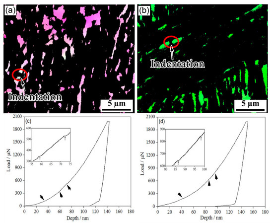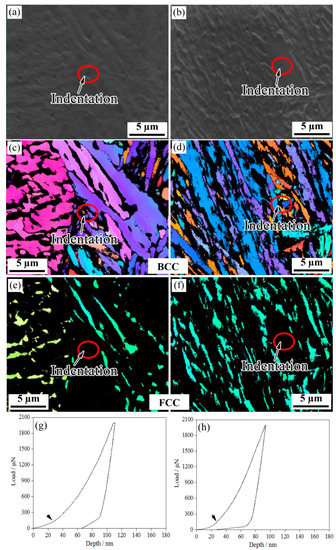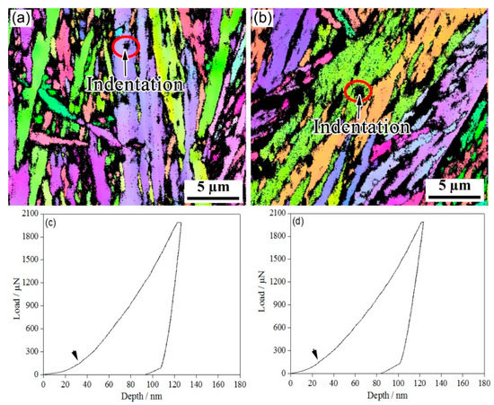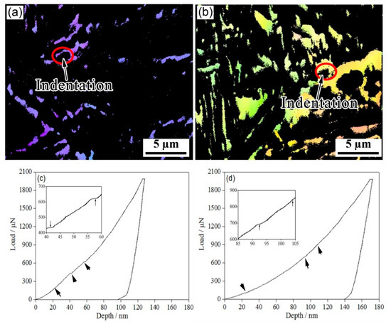 Figure 6 shows the nanoindentation–EBSD characterization of blocky RA. A number of minor pop-in points (Figure 6c,d) were observed in the L-D curves of blocky RA; these were related to both the nucleation of the dislocations and the martensitic transformation of RA under stress [20]. In the one-step method, the indentation depths of the pop-in points related to the phase transition were between 40 nm and 80 nm; in the two-step method, the indentation depth of the pop-in was over 80 nm. The two-step method delayed the pop-in point. At the same time, as martensite is much harder than austenite, and the lattice parameters of martensite are larger than those of austenite, the martensitic transformation of RA during the deformation inevitably increased the strain hardening rate.