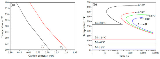 Figure 8 shows the T0 (equilibrium transformation) curve calculated by MUCG83 software [22]; the isothermal bainitic transformation diagram was calculated by J-MatPro 4.0 software (Cambridge, UK) [23]. The carbon was diffused from supersaturated bainite to an untransformed austenite phase in the isothermal process. When the carbon content in the austenite reached a temperature of T0 or T0′, the bainitic transformation process almost stopped, causing an incomplete evolution in the bainitic steel [24]. The carbon content of austenite is, theoretically, 0.74 wt.% and 0.87 wt.% after isothermal bainitic transformations at 350 °C and 300 °C, respectively.