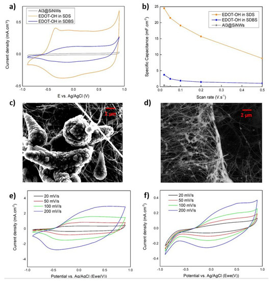 In SEM, visually, more PEDOT-OH was deposited on the Al3@SiNWs in SDS conditions (Figure 3c), forming large nucleation spots that propagate along the length of the nanowire creating conical structures. PEDOT-OH deposition in SDBS conditions (Figure 3d) seems to form smaller spherical grains. Hardly observable in the SEM principal electrons detector, a change to secondary electron detector scan mode (SE2) showed small polymer particles all along the nanowires (50 to 200 nm of diameter). For the same concentration of monomers polymerized, the efficiency over 100 cycles of electropolymerization was about 10 times higher for a SDS surfactant. Appearing clearly on symmetrical CV, the current density from the pseudo-capacitive material was reaching 200 mV·s−1 up to 3.6 mA·cm−2 for SDS and 0.39 mA·cm−2 for SDBS electropolymerization method. From those increased scan speed CVs, the polymer film had two different responses regarding the surfactant used. Although the surfactant had a major impact on the efficiency of the electropolymerization, it also influenced the morphology of the deposited PEDOT-OH, leading to different CV responses shapes and peaks slight shifts. Here, the scan speed is not directly proportional to the capacitance and is rather being fit with a square root dependency, showing that the pseudo-capacitance behavior is contributing to the energy storage mechanism. By looking in the literature, these performances are slightly higher than the performances of the PEDOT:PSS on protected SiNWs [48,49] (from 6 to 15 mF·cm−2). However, these results must be taken with hindsight since the system with PEDOT:PSS has a narrower electrochemical window, and a better stability to the increase in potential. Indeed, the PEDOT-OH has a weak stability over the increase of the scan rate, since the kinetic of pseudocapacitive processes is determined by slow faradic reactions compared to pure capacitive storage.