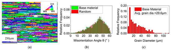 Grain morphology, misorientation angle and grain size of the base metal. (a) Grain morphology, (b) misorientation angle, (c) grain size.