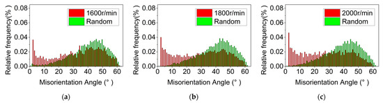 Misorientation angle of RZ at different plug speeds. (a) 1600 r/min, (b) 1800 r/min, (c) 2000 r/min.