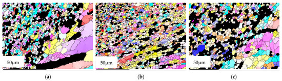 Figure 4, Figure 5 and Figure 6 show the grain morphology, grain size and misorientation angle of RZ of FPW joints at different rotational speeds of the plug, respectively. Since RZ is the transition zone between the plug and base metal and from NZ to TMAZ, the shape of the grain changes from equiaxed to long strip. Therefore, the grain’s transitional characteristics are obvious in RZ. The average grain size of RZ increases with the increase in rotational speed of a plug when other parameters are constant. The misorientation angles of the RZ deviate from random orientation distribution, and there are no obvious preferred orientations.