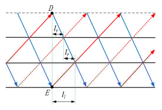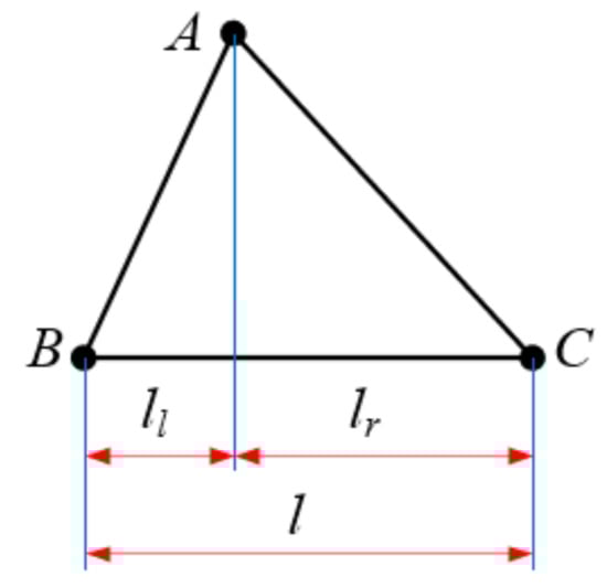 As shown in Figure 3, to ensure the continuity of the winding process, it should be provided that termination point D of this loop and start point E of the next loop coincide after one continuous winding of the fibers. As shown in Figure 4, triangle ABC is a repeating unit of the truss, rods AB and AC are the webs of the truss and rod BC is the chord of the truss. Let the pitch of the truss be l. The horizontal spacing A between the upper vertex A and the left vertex B of triangle ABC is called the left span . Similarly, the right span is . The ratio of the left span to the pitch of the truss becomes the left span ratio, noted as x, . According to Figure 3, the left span is two times the proper span, i.e., ; similarly, the right span can be two times the left span, i.e., .