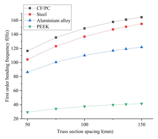 To ensure that the number of repeating units N of the joist is an integer, the joist section spacing l is 50 mm, 75 mm, 100 mm, 125 mm, 136.4 mm, 150 mm, 166.7 mm, 187.5 mm, 214.3 mm, 250 mm and 300 mm, respectively. The joist material is chosen from structural steel, aluminum alloy, PEEK and PC/CF, respectively. Figure 7 shows the change curve of fundamental frequency for different materials. With the constant total length of the joist, section edge length and diameter of the joist rod, the first order vibration frequency of the beam increases as the pitch of the joist increases. The fundamental frequency change of different materials is also other, PEEK vibration frequency is the least and CF/PC vibration frequency is the most.