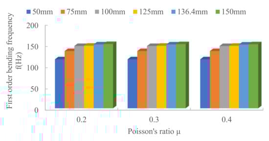 The joist section spacing l is 75 mm, the total length of the joist is 1500 mm, 2025 mm, 2250 mm, 2475 mm, 3000 mm, 4500 mm and 6000 mm, respectively and the material of the post is PC/CF. The simulation results are shown in Figure 12. The first-order bending frequency of the beam decreases as the length of the joist increases.