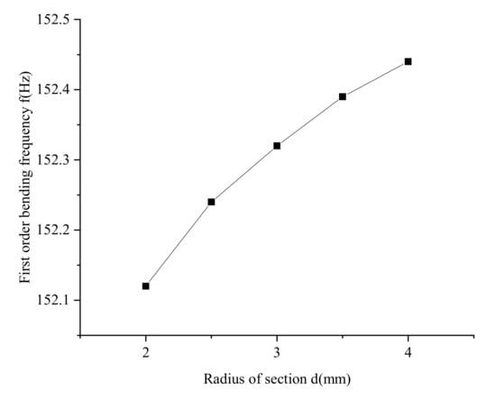 The joist pitch l is 75 mm, the cross-sectional diameters of the joist rods are 2 mm, 2.5 mm, 3 mm, 3.5 mm and 4mm, respectively, and the joist material is chosen as PC/CF. The simulation results are shown in Figure 10. In the selected parameter range, the first-order bending frequency of the joist increases slowly with the increase of the section diameter. Still, the variation range is 0–0.3 Hz, which is negligible. Therefore, the truss rod section diameter does not affect the vibration frequency change of the truss.