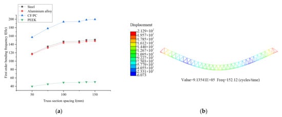 Effect of section spacing of the truss on the fundamental frequency: (a) Simulation comparison curve; (b) Simulation results.