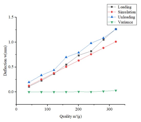 The slope of the curve can be derived from Figure 14, and the slope and L = 0.8 m are substituted into Equations (15) and (16) to obtain . Substituting b = 75 mm, dl = 2 mm and into Equation (17) to get the theoretical value of joist flexural stiffness . With the increasing mass of the loaded weight, the deflection value of the joist sample also increases. During this change, the connection defects at the nodes of the joist sample have a more significant influence on the stiffness of the joist.