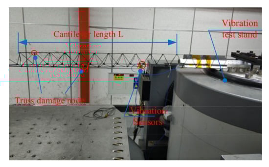 The experimental setup for truss vibration characteristics testing is shown in Figure 16. A 2 m-long continuous truss sample is prepared using the truss construction system, and the truss sample is placed on the vibration platform and fixed with a heavyweight. The vibration sensor is specified on the truss, and the vibration frequency of the vibration platform is set to 0–300 Hz to sweep the truss sample. Finally, the truss’s first four-order frequency values were obtained, and the results are shown in Table 2.