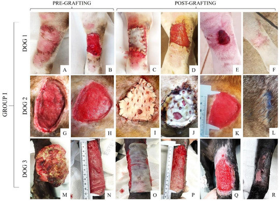 | Dog 1 (Group I) | Bull Terrier | M | 5 | No | Surgical | Actinic dermatitis | Left metatarsal region | 4.32 × 3.75 cm |