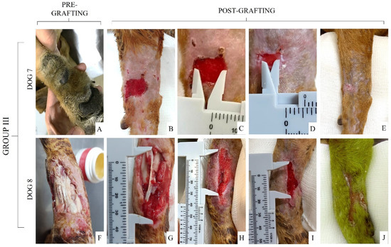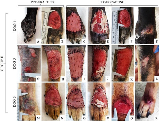 | Dog 5 (Group II) | Mixed breed | M | 7 | No | Surgical | Ulcerative dermatitis | Lateral region of left forearm | 7.07 × 3.0 cm |