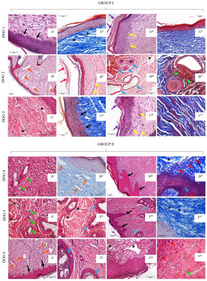 | Dog 6 (Group II) | Mixed breed | M | 7 | No | Surgical | Hyperplastic dermatitis associated with dermal fibrosis | Metacarpophalangeal region, proximal phalangeal region, proximal interphalangeal region, and left-middle phalangeal region | 4.15 × 4.0 cm |