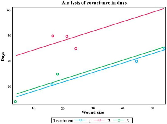 | Dogs | Initial Wound in cm2 (Width × Height) | Time for Complete Healing, Post-Graft Wound (Days) | Average Days, Duncan’s Test (Alpha = 0.05) |