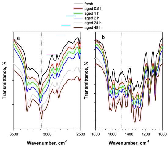 DRIFT spectra of 2 wt.% PA/KBr in (a) the 3500–2500 cm−1 region and (b) the 1800–1000 cm−1 region. The black curve represents the fresh sample, whereas the colored curves represent the sample artificially aged at 80 °C for up to 48 h under an Ar flow.