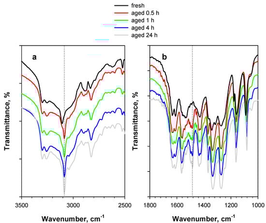 DRIFT spectra of 2 wt.% PA/KBr in (a) the 3500–2500 cm−1 region and (b) the 1800–1000 cm−1 region. The black curve represents the fresh sample, whereas the colored curves represent the sample artificially aged at 80 °C for up to 24 h under a 5 vol.% O2/Ar flow.