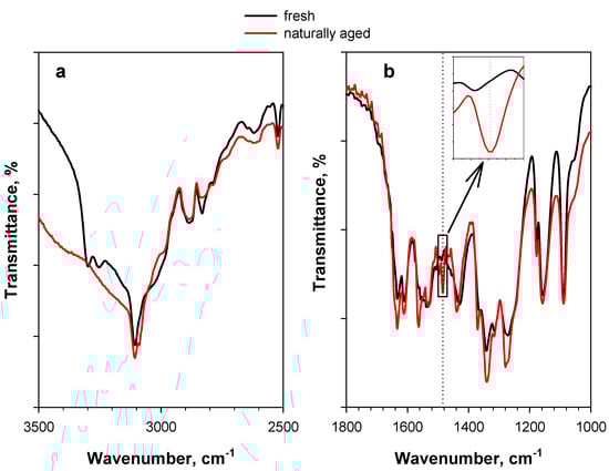 Similar effects can also be observed in the case of naturally aged PA, i.e., PA stored for more than 10 years at ambient conditions in the Calorimetry Laboratory of CNR-STEMS (Figure 4). A band at 1485 cm−1 is also present in this case (in addition to a band at 1565 cm−1) (Figure 4b), whereas the possible dominance of a double band at 3300–3250 cm−1 is likely masked by the stronger hydration of aged PA, resulting in a larger broad band in the region of hydroxyl stretching (Figure 4a).