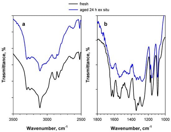 DRIFT spectra of 2 wt.% PA/KBr in (a) the 3500–2500 cm−1 region and (b) the 1800–1000 cm−1 region. The black curve represents the fresh sample, whereas the blue curve represents the sample artificially aged ex situ at 80 °C for 24 h in air. Like the spectrum of fresh PA, the spectrum of ex situ aged PA was also recorded at 30 °C under an Ar flow.